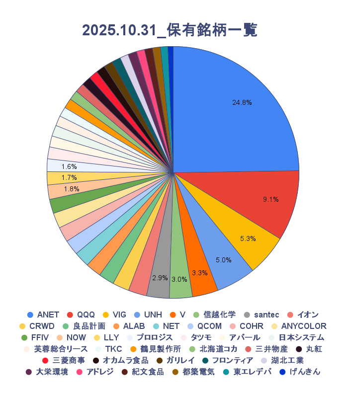 保有比率トップは相変わらずの【ANET】です。ピカピカグロースと違って安定感あってすき(なお年初に株価半値)