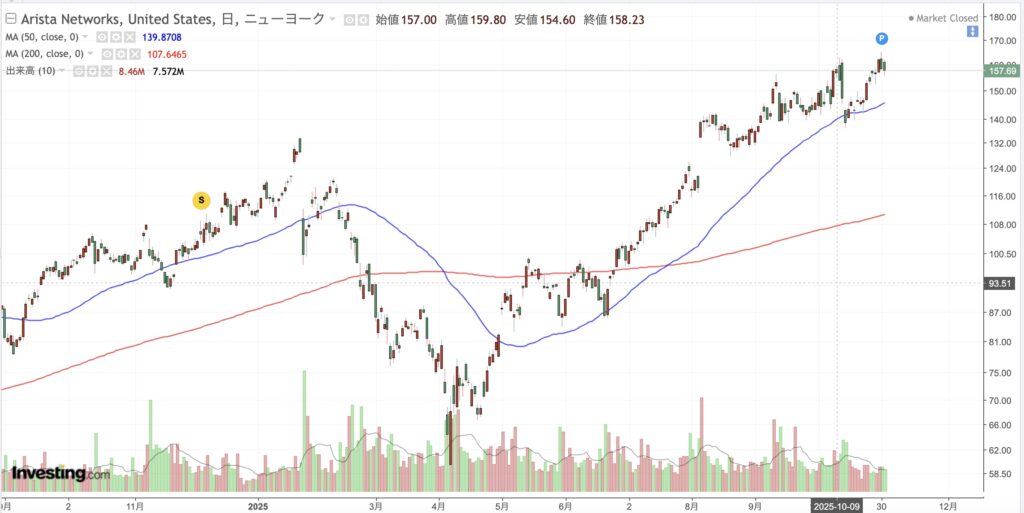 保有比率トップは相変わらずの【ANET】です。ピカピカグロースと違って安定感あってすき(なお年初に株価半値)