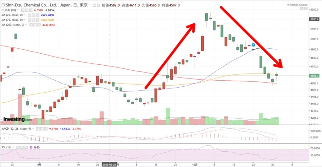 日本株は【信越化学工業】に期待してたけど、もう全然だめだねこれ。ホントいい加減にしてほしい。